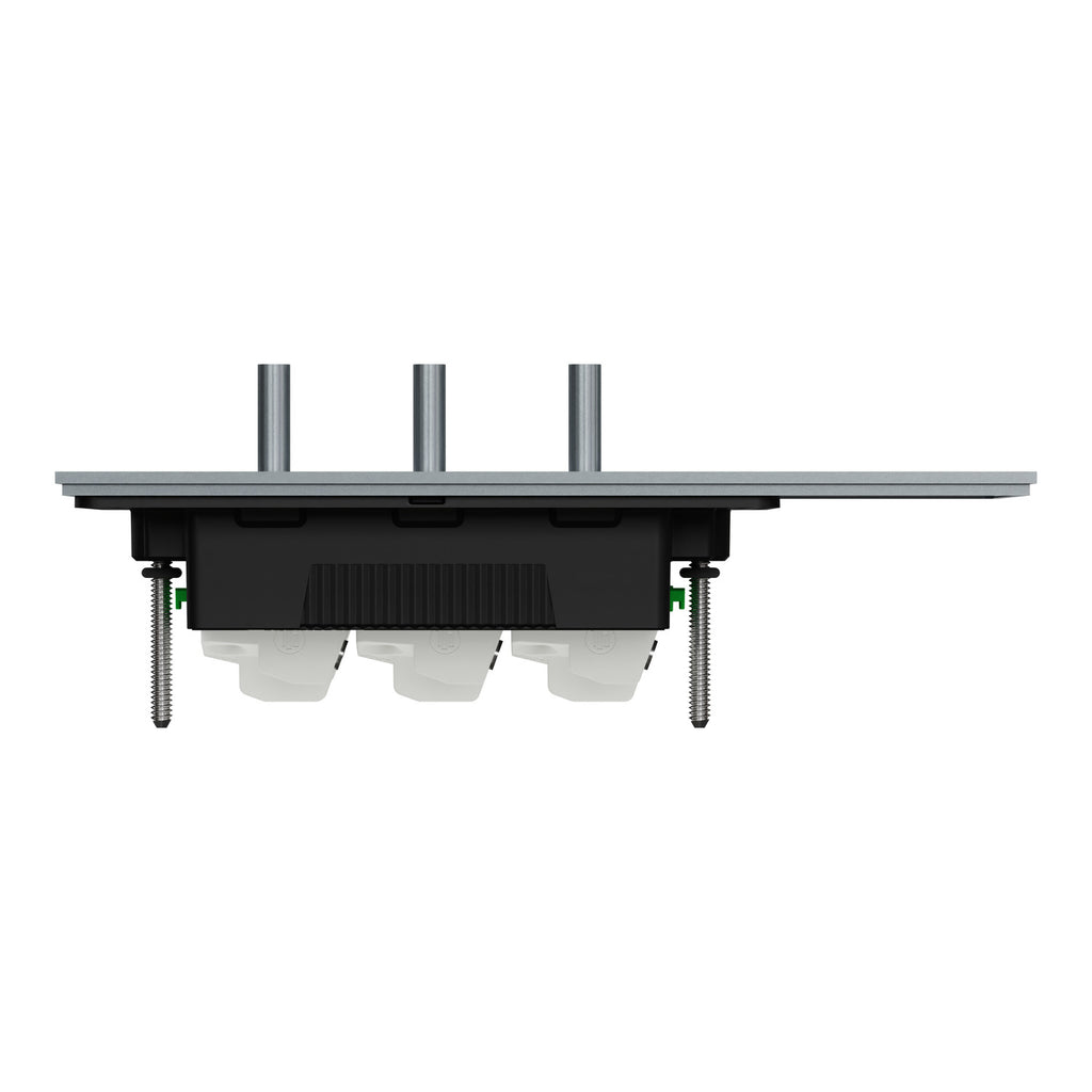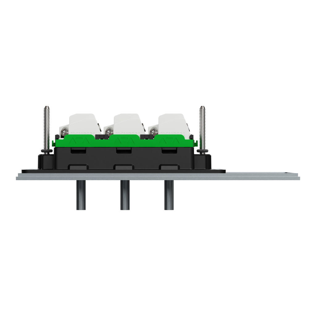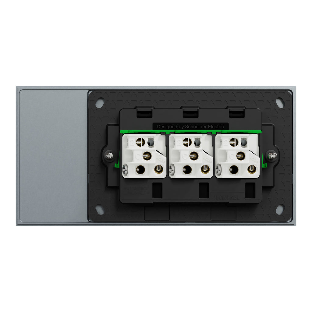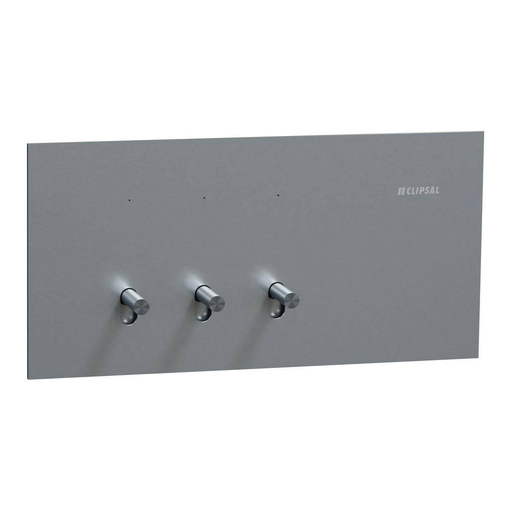 The Clipsal Solis T Series switch is designed to meet the needs of residential, commercial, and hotel applications. This 3-gang toggle switch offers convenient 1-pole 1/2-way control. The rated current is 20A/16AX and the rated operational voltage is 230/240VAC. The device comes with a screw terminal that offers a more secure connection for larger wires, reducing the risk of loose wires caused by external factors. This device allows for flush mounting. Screws are available for installation. It is intended to be installed horizontally only. The dimensions are (W) 148mm x (H) 74mm x (D) 56mm, and the embedding depth is 41mm. Discover the perfect fit with an 84mm fixing center and 3.6mm thickness for seamless integration into your projects. The color of the product is platinum. Its operating temperature is from 0°C to 45°C. The Clipsal Solis range now offers a choice of contemporary white and black finishes for modern home spaces. Create aesthetically pleasing electrical designs that complement your style.