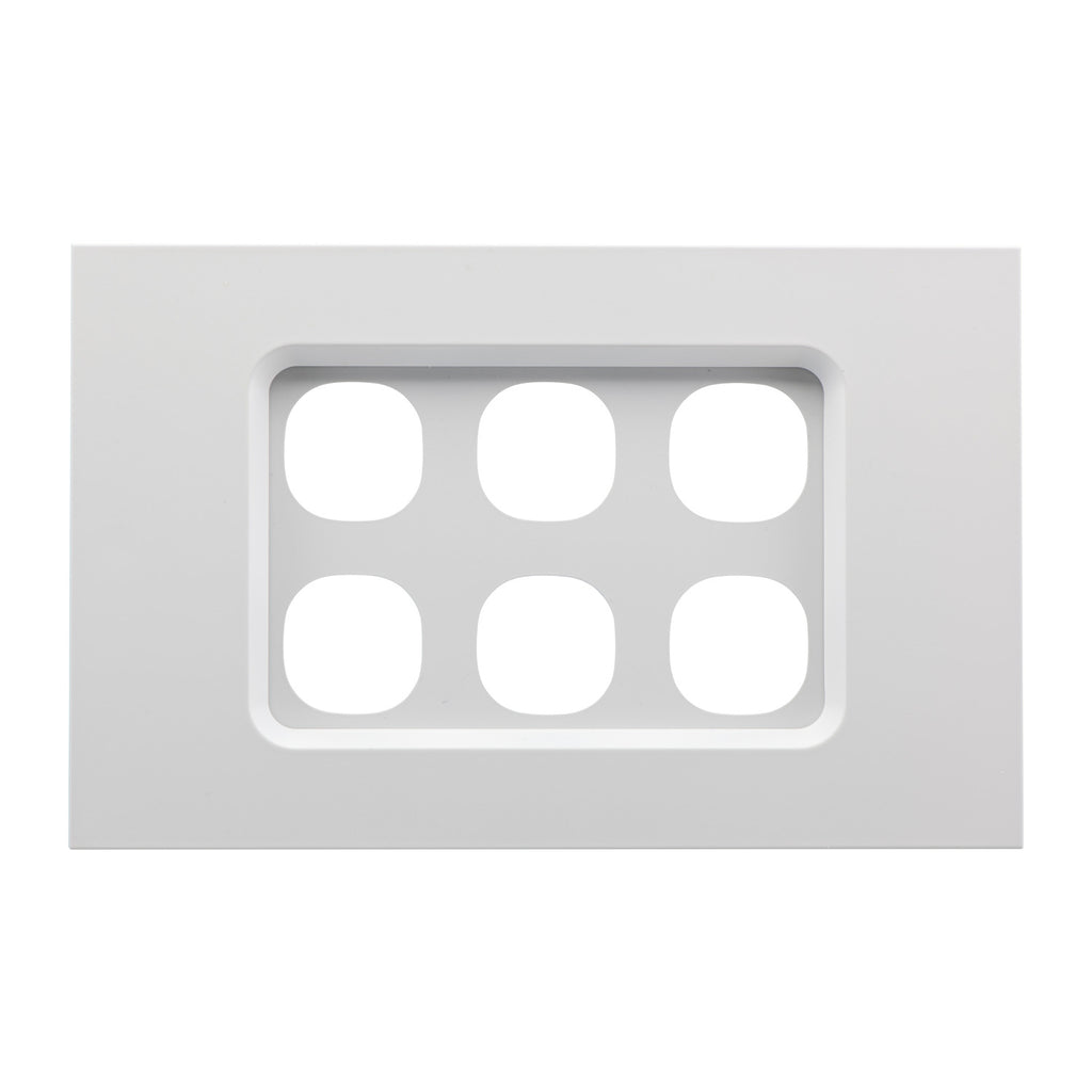 Switch grid and cover. Switch mechanisms are purchased separately. Suitable for 6-gang installations. Clipsal Saturn Zen. Colour: Zen White Note: Requires installation by an appropriately licenced electrician.