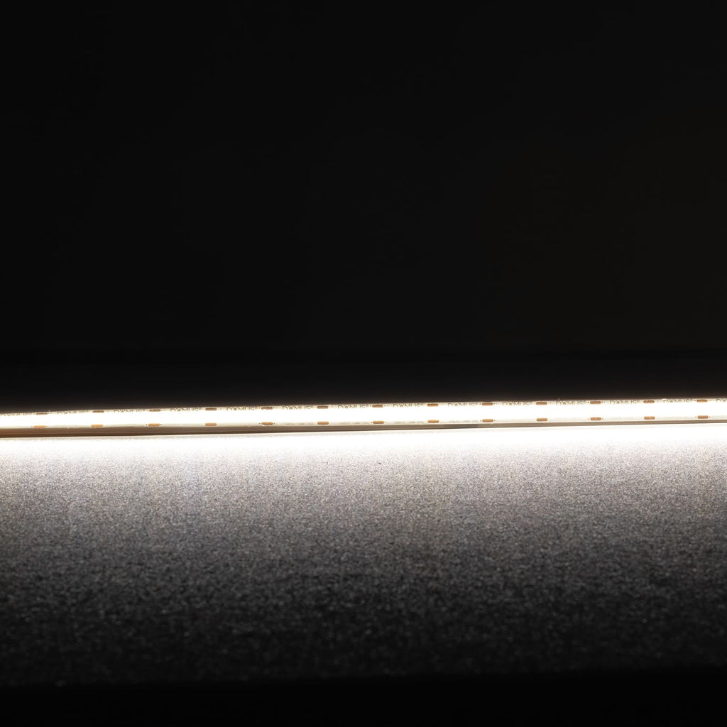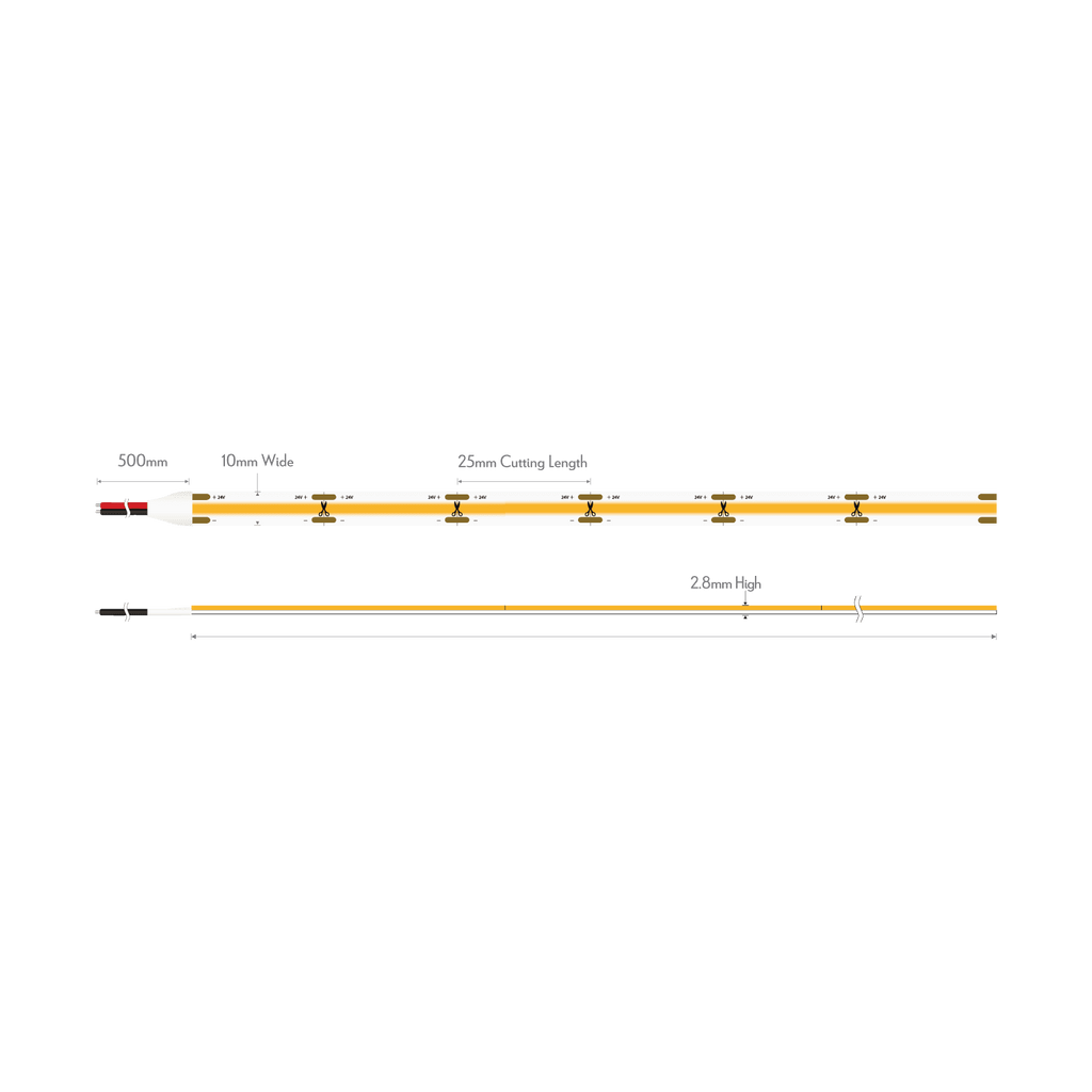 The PLEX-COB 10w per meter IP54 LED strip incorporates the latest in LED COB chip technology, with true dotless appearance utilising 640 LEDs per metre. Operating on 24V DC allows for less resistive heat and longer run lengths. Longer areas of weldless joints provide a more reliable solution avoiding breaks in continuity.