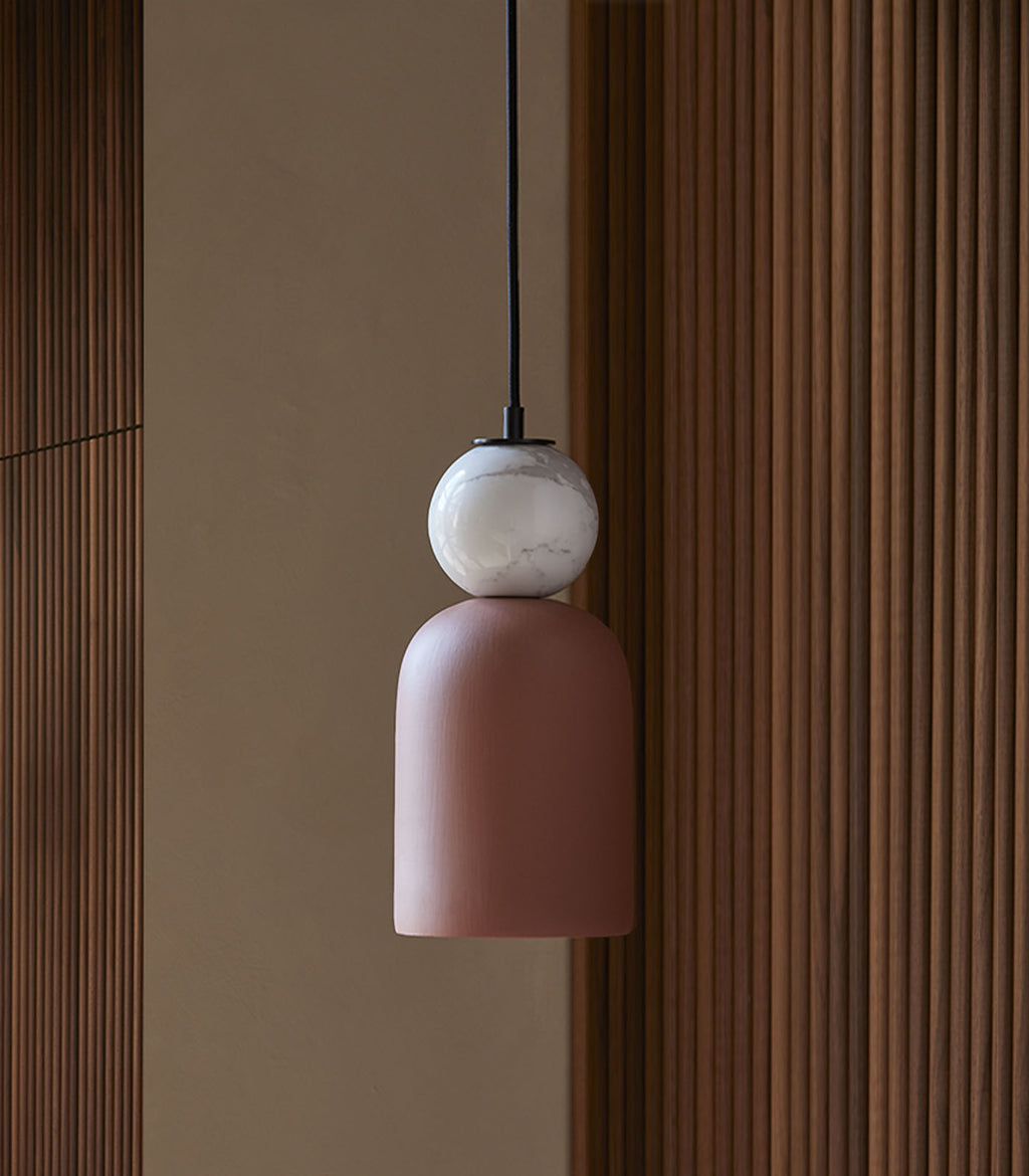 Bell Copo Pendant Light by Aromas Del Campo was designed by Pepe Fornas. Bell Copo features a marble ornament which sits above a ceramic dome shade resulting in a minimal and clean aesthetic.