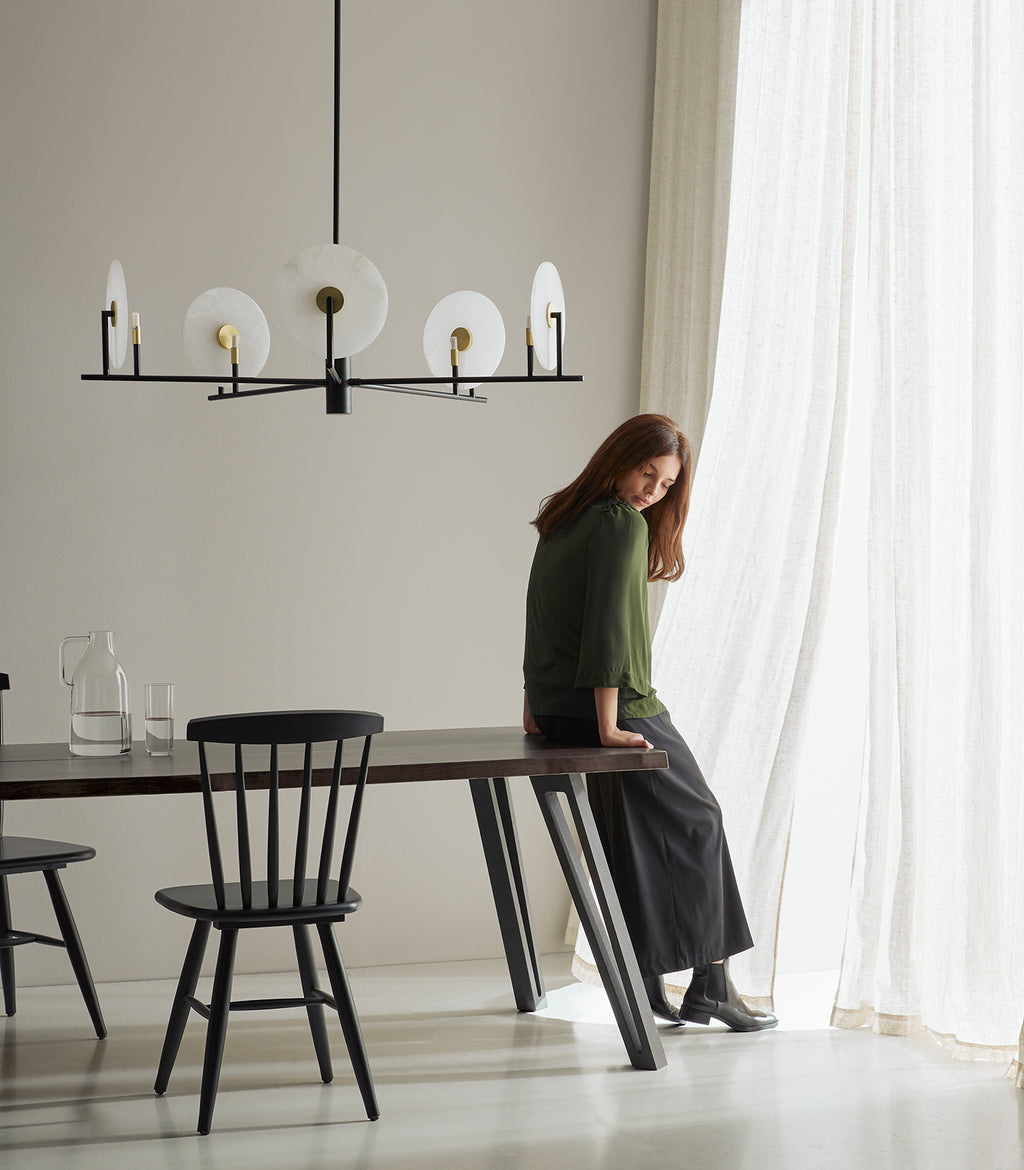 The Erto 5lt Pendant Light designed by Pepe Fornas for Aromas Del Campo is an elegant eye-catching indoor light fixture made from black and brass metal components and an alabaster disc accessory.