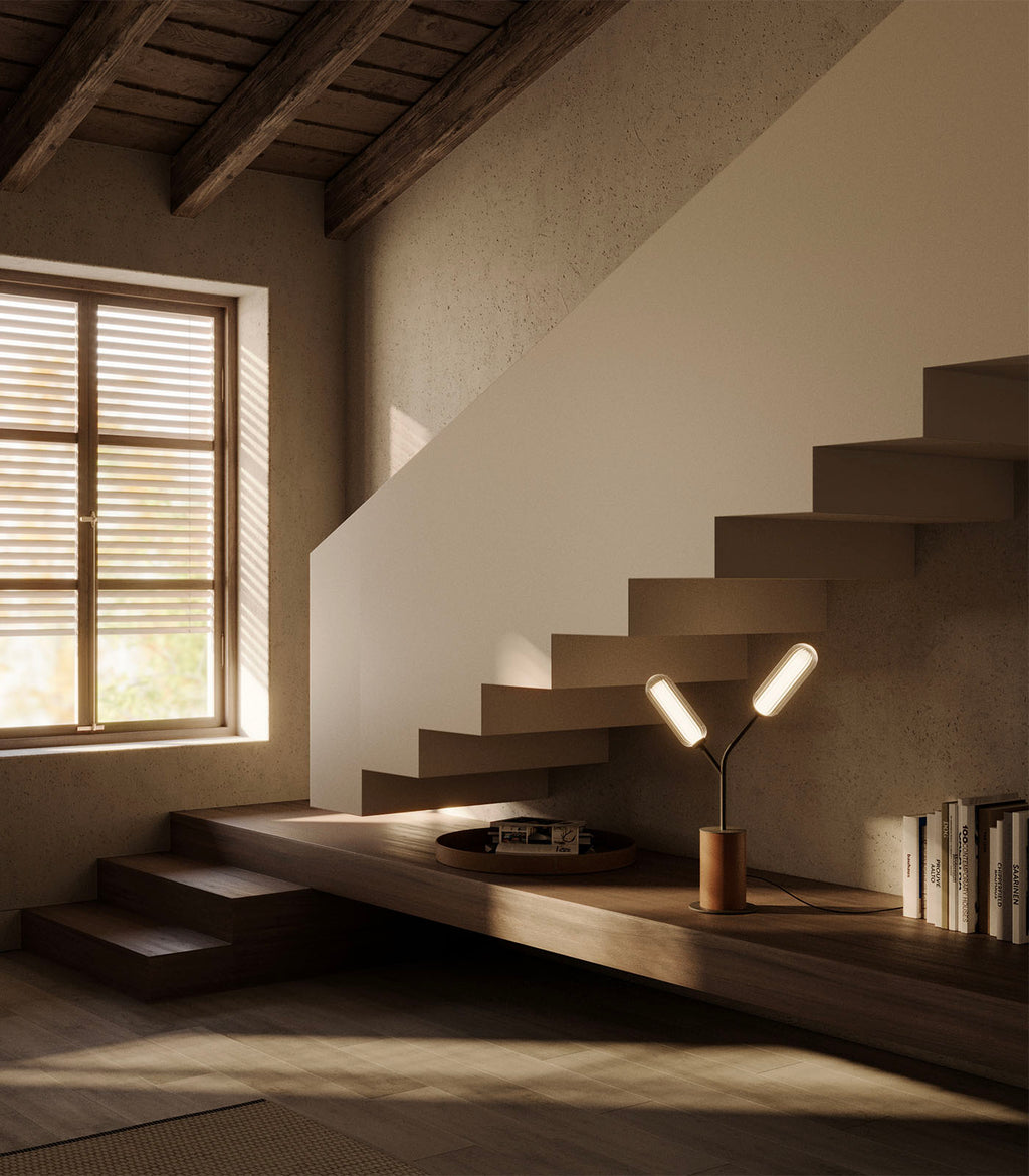Lari Table Lamp by Aromas is a striking exploration of materiality and form. Slender steel stems rise gracefully, culminating in striped glass cylinders that encase an opal acrylic core, casting a soft, ethereal glow when illuminated.