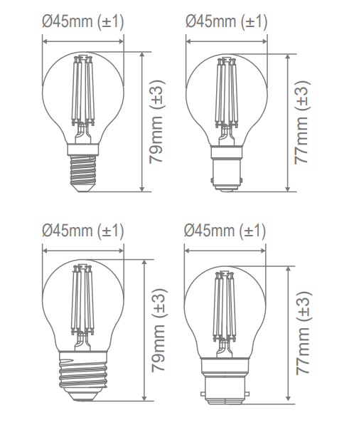 4.2W Mini household globe, fancy round shape. Available in ES (E27), BC (B22), SES (E14) and SBC (B15) base options. 2700K Warm White and 6500K White LED colour temperature options. Clear and frosted glass diffuser options. Fully dimmable with suitable dimmers.