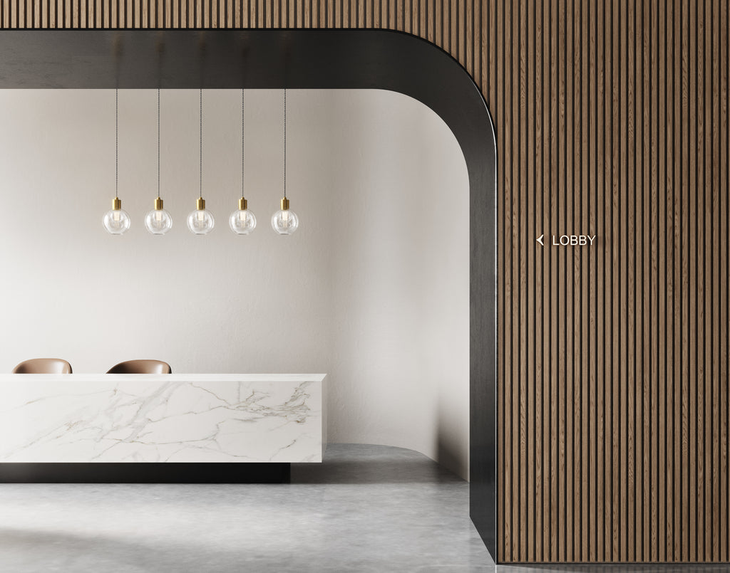 Parlour Sphere features glass shades available in four finishes that can be mixed and matched to achieve a unique composition and effect.