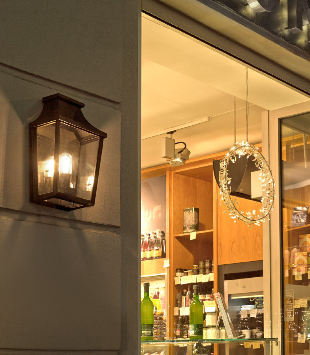 London Flush Wall Light by Norlys is a traditional style outdoor lantern fixture with two finishes to choose from.