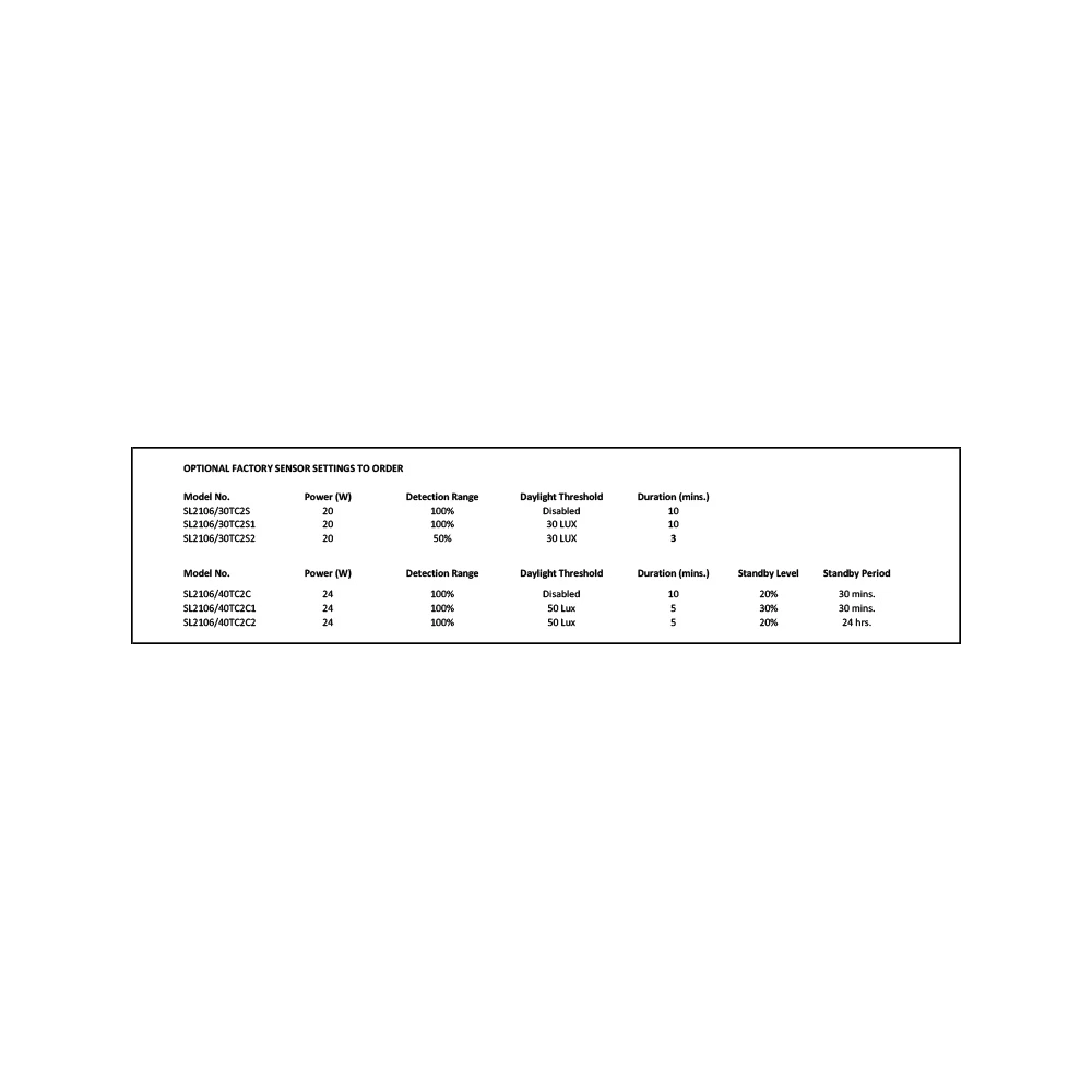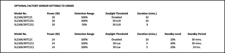 | SL2106/40TC2 | 240 | 24 | 2400/2750/2500 | 3000/4000/5700 | 80 | 120 | WHITE | 350 | 73(H) | 1.08 |